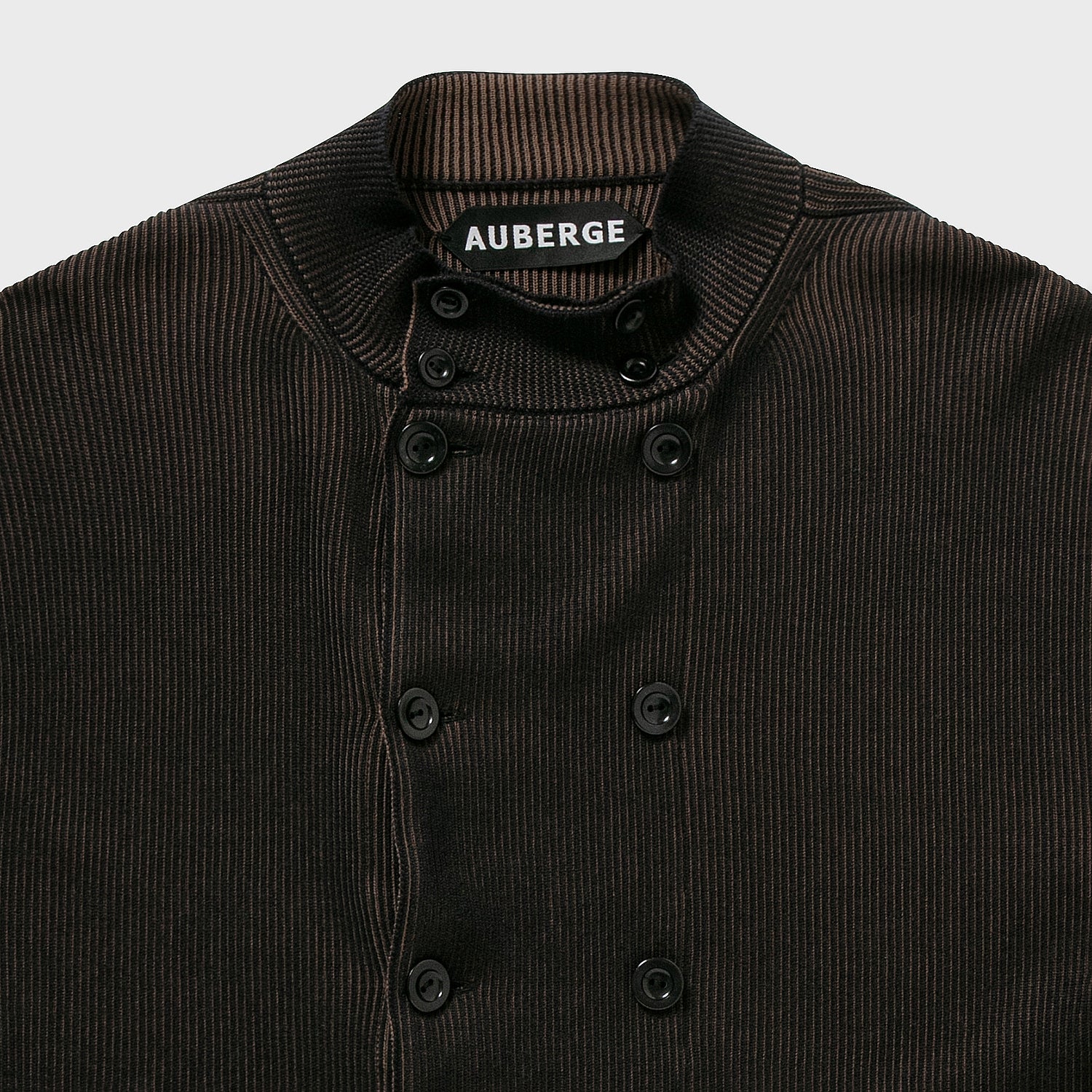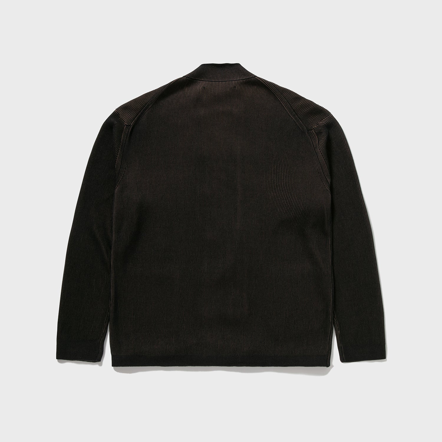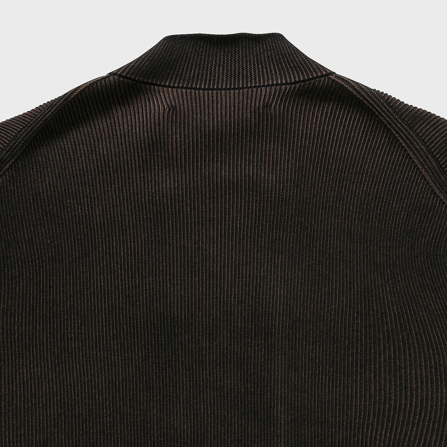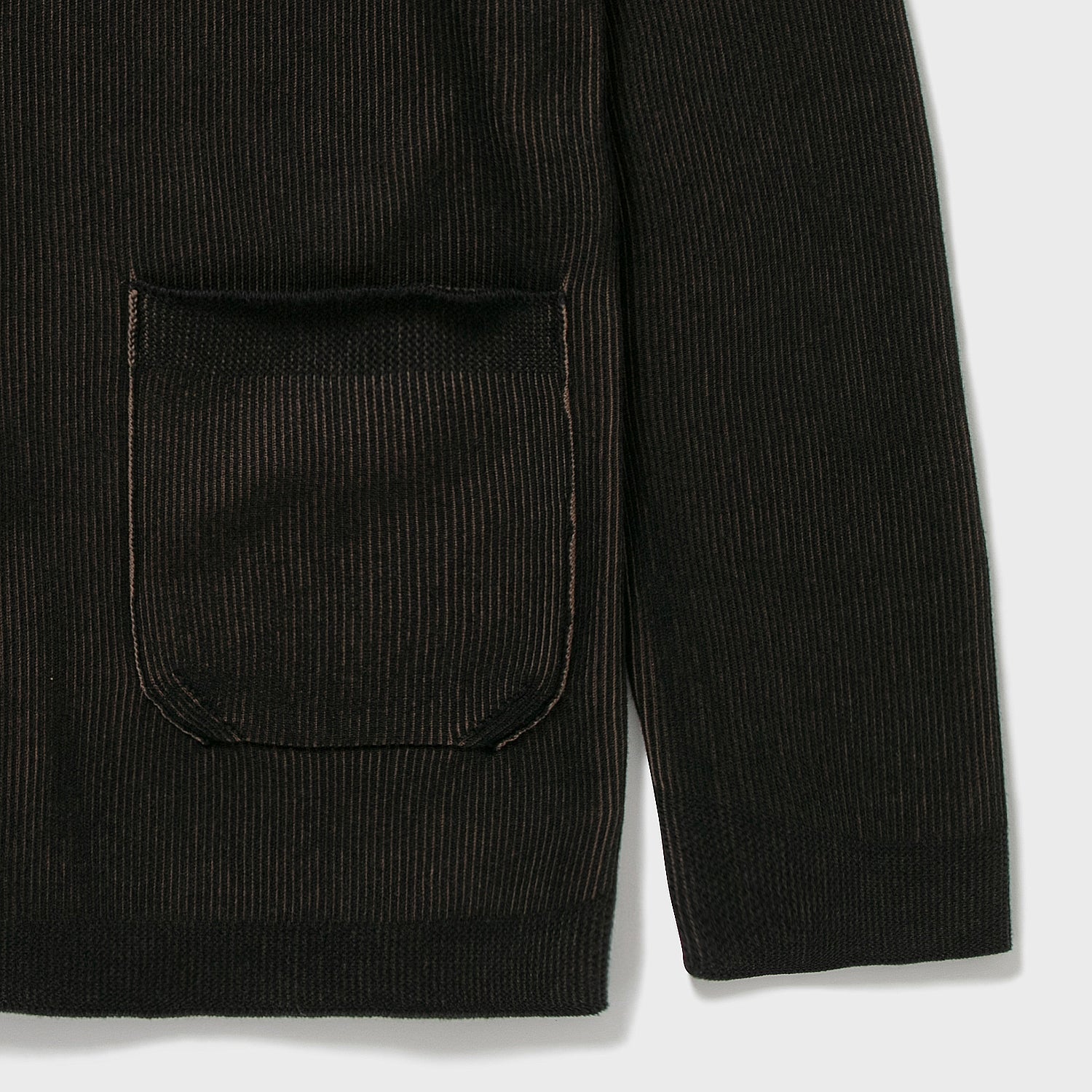 コットン100%糸を強撚加工し、ややざらっとしたタッチの両畦成形編み。日本には編機のメーカーで圧倒的なシェアを持つ島精機製作所で試したが、100年前の度目にどうしても到達することができず、最後の切り札、ドイツ・ストール社の畦編機で今回ようやくヴィンテージのシッカリ感まで持ち込むことに成功した。