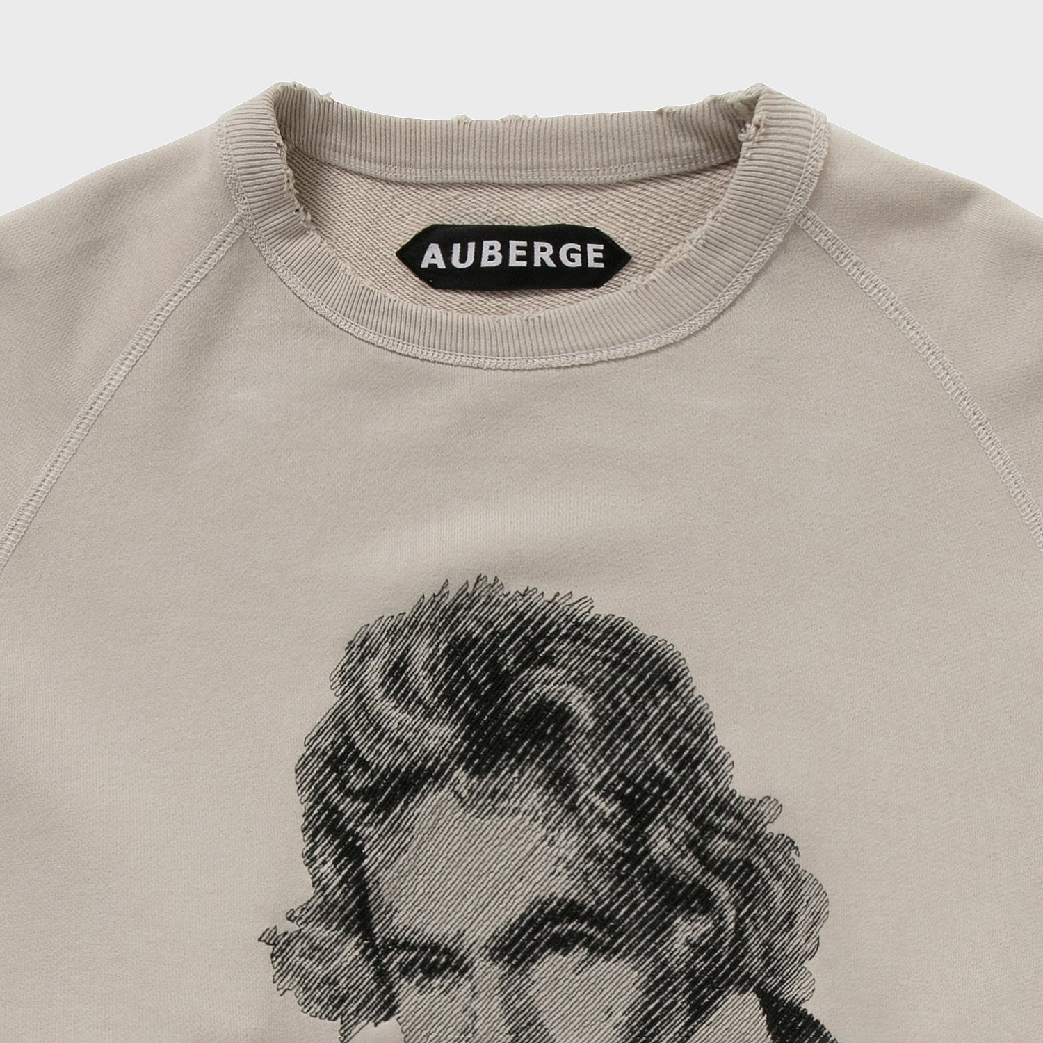 胸元のベートーベンはなんと刺繍で表現されている。これはAUBERGEがしばしば採用する写真画像を地震計の針のような動きで再現する桐生の刺繍工場の技術である。ちょっとレトロでアート感あふれる仕上がりが毎回気に入っている。ちゃんとこの画像に関してプロダクトライセンス料を支払っての使用である(笑)。あえてベートーベンにしたのは、数多のブランドがこのモチーフに挑み、たいてい刷るだけの中で、このモチーフをジャズスタンダードの名曲に見立てAUBERGEならこう演奏する、そんな気分のアプローチなのである。なので有名スタンダードネタである必要があった。
