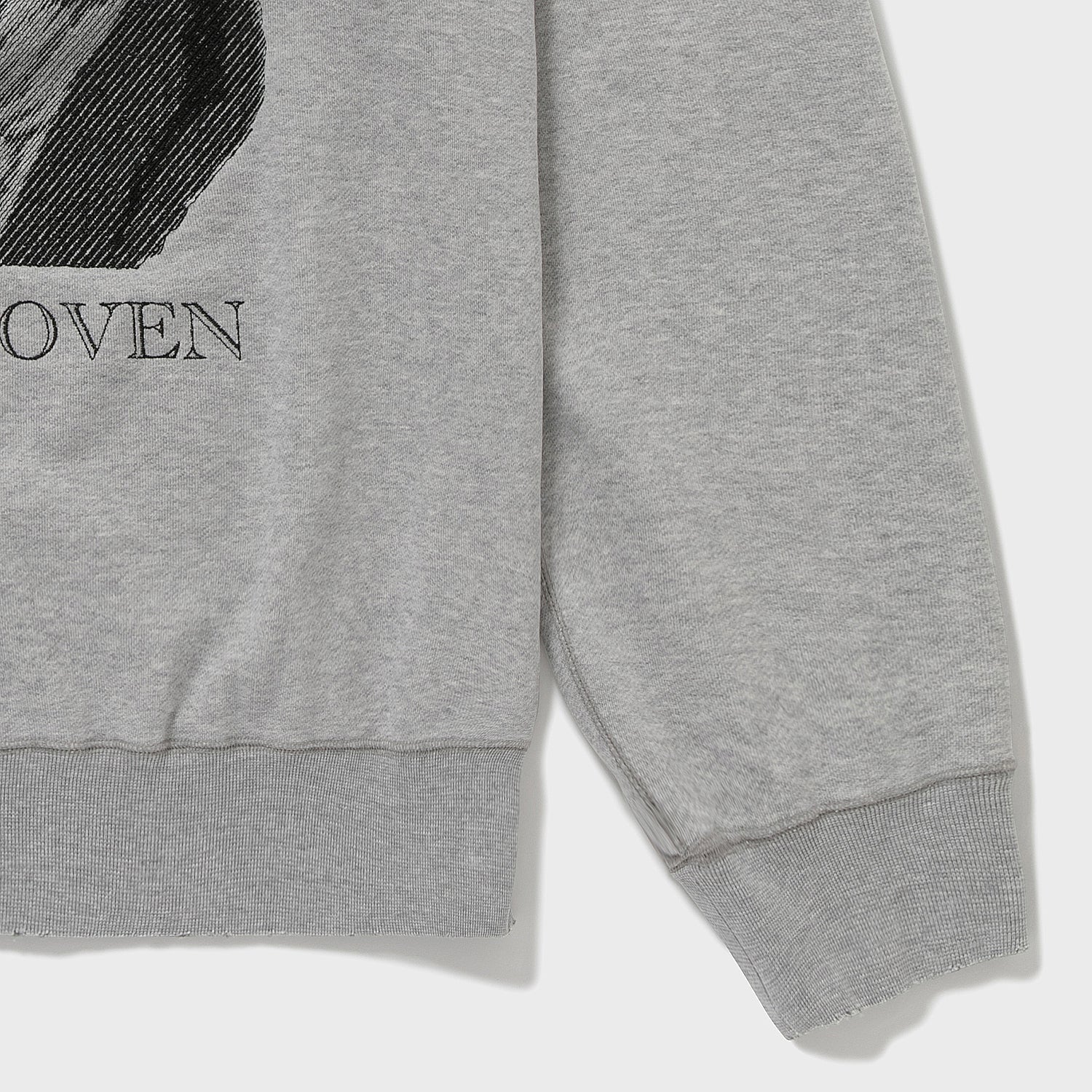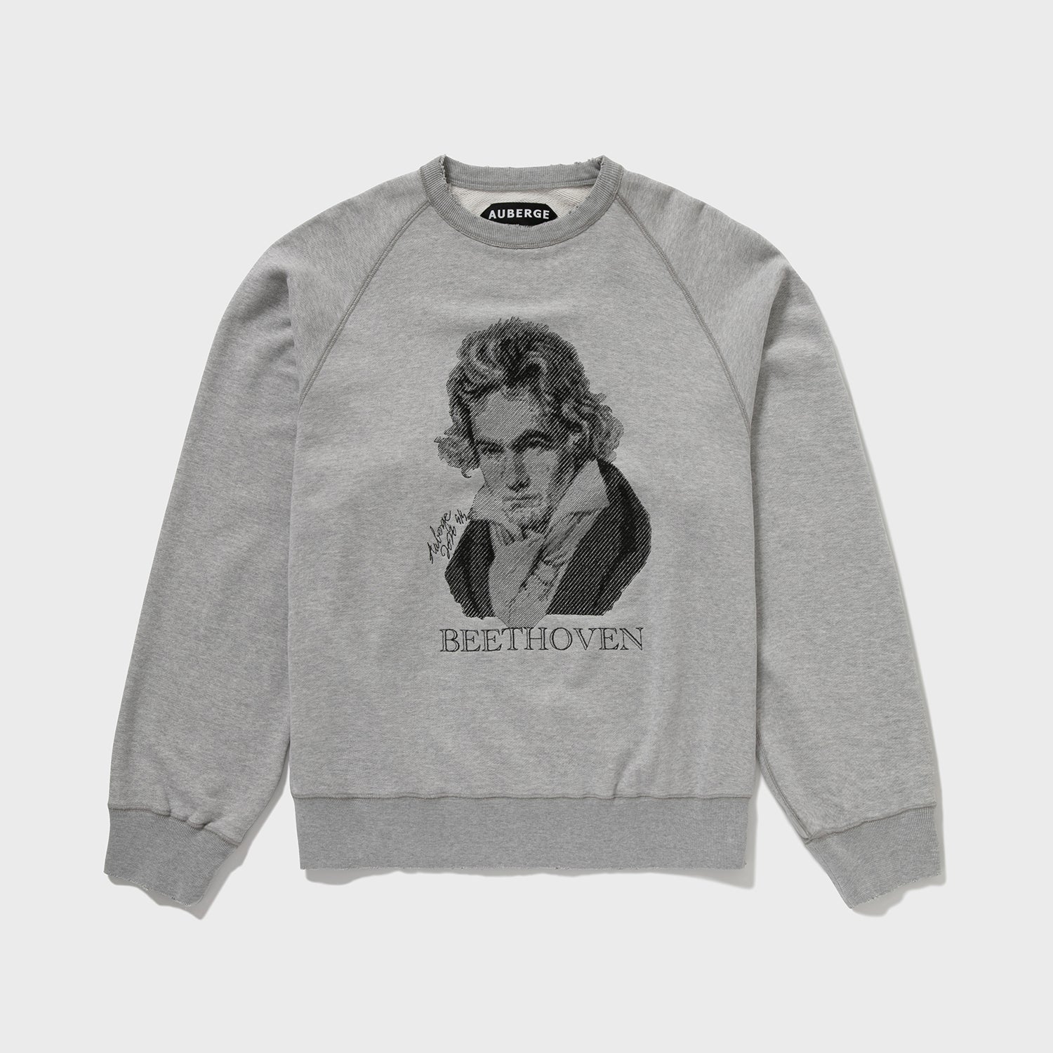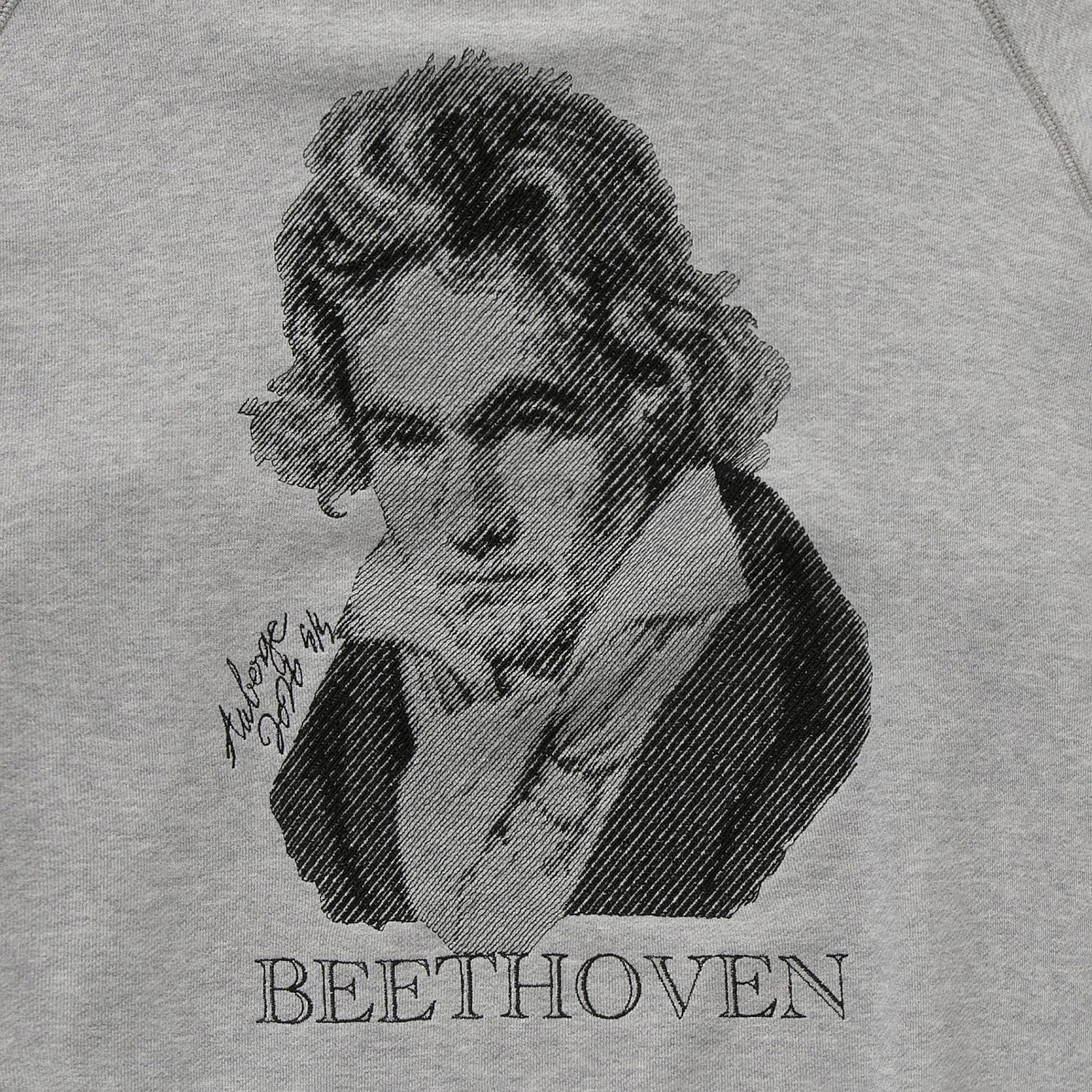 胸元のベートーベンはなんと刺繍で表現されている。これはAUBERGEがしばしば採用する写真画像を地震計の針のような動きで再現する桐生の刺繍工場の技術である。ちょっとレトロでアート感あふれる仕上がりが毎回気に入っている。ちゃんとこの画像に関してプロダクトライセンス料を支払っての使用である(笑)。あえてベートーベンにしたのは、数多のブランドがこのモチーフに挑み、たいてい刷るだけの中で、このモチーフをジャズスタンダードの名曲に見立てAUBERGEならこう演奏する、そんな気分のアプローチなのである。なので有名スタンダードネタである必要があった。